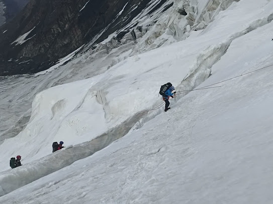 Спуск в 1 лагерь. Еще один день акклиматизации на высоте 4200 м. Проверка снаряжения для завтрашнего выхода, упаковка вещей. Снежно-ледовые занятия..